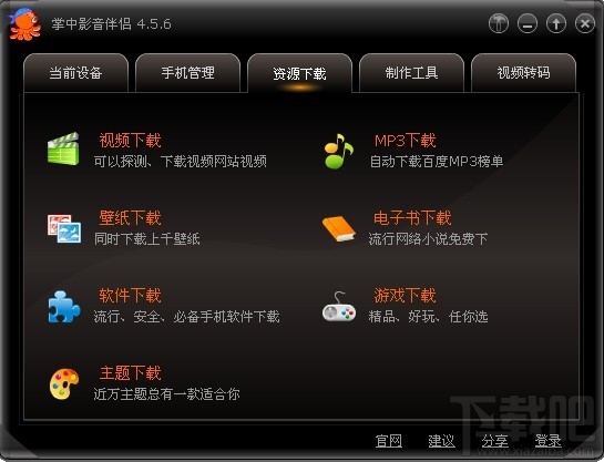 掌中影音伴侣(XMedia)是一款为移动设备提供资料的工具。掌中影音伴侣能够为手机、MP4、mp3、苹果、PSP等掌上设备提供视频、软件、mp3、电子书、游戏、壁纸等多媒体资源下载、制作、传输服务等。
