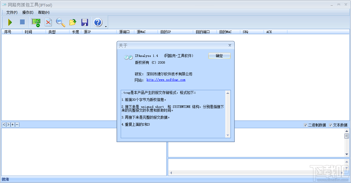 网路岗网络抓包工具(iptool)是一款好用的网络抓包工具,使用方法很简单,解压后运行IPAnalyse.exe,点击绿色开始按钮即可开始进行网络抓包,抓包信息包括时间、类型(TCP/UDP)、长度、源IP、源端口、源MAC、目的IP、目的MAC、目的端口、SEQ和ACK等,单击每条记录都可查看详细信息。