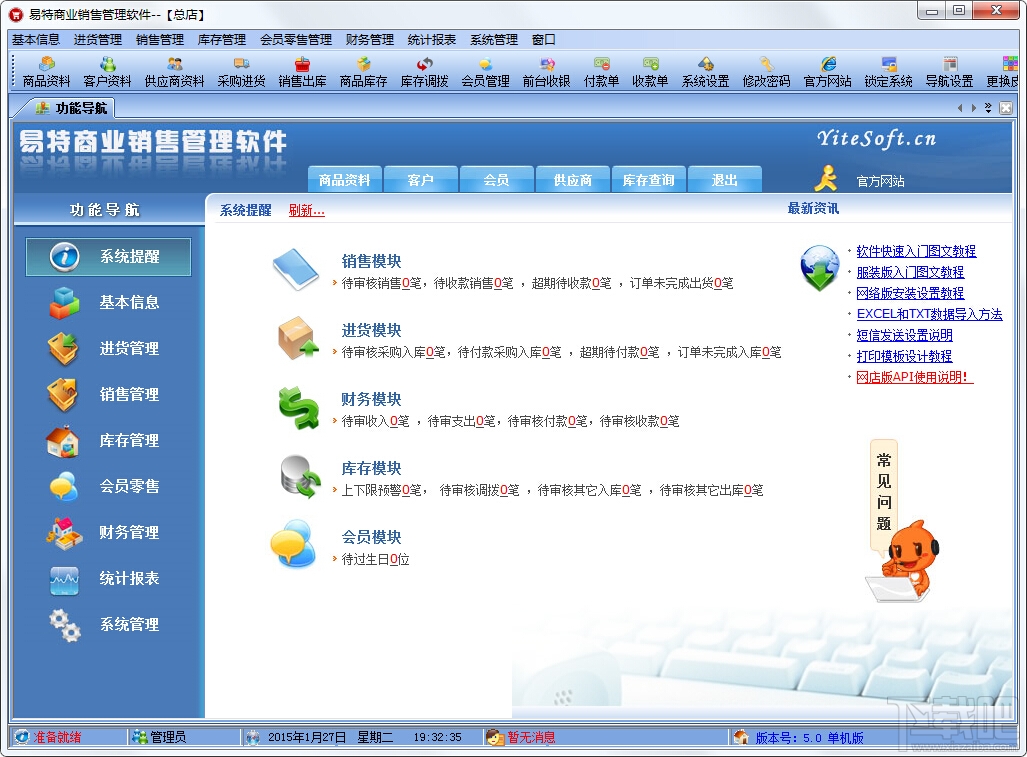 易特商业销售管理免费版是一款专业的销售管理软件,其中包含商品销售管理系统 ,库存管理系统,财务和报表系统等子模块。软件界面设计简洁,美观,其人性化的软件流程,使普通用户不需培训也能很快掌握软件操作使用方法,上手极易。强大报表与集成查询功能是本软件的比较大特色,所有功能在用户需要的使用地方自然体现,不用打开多个窗口重复查询。适用于商贸公司,个体门店等用于商业销售管理, 库存管理,财务管理等,客户管理,员工管理等场合,是您企业进行信息化管理的强大工具。易特商业销售管理软件适用对象:商贸公司、批发零售等行业、店铺,连锁分店以及个人销售管理等。