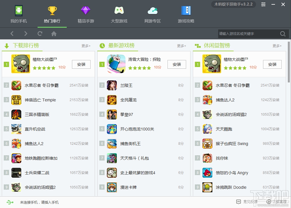 木蚂蚁手游助手是一款完全免费的安卓智能手机游戏安装管理助手,木蚂蚁手游助手拥有内含海量的精品手游,以内容全,下载快,汉化内容多为特色,木蚂蚁手游助手在界面上和功能操作方面,充分考虑国人使用习惯。