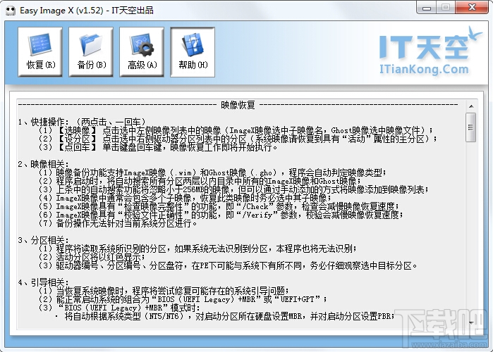 一直以来很多朋友都在使用ghost来管理映像文件,也有一些善于探索的朋友开始使用imagex来执行映像备份恢复操作。但,一来操作繁琐,二来参数复杂,难于操作和记忆,易出现操作失误。有没有人想过,我们何不把传统的ghost和流行的imagex合二为一?Easy Image X就是这样的一款软件,Easy Image X使系统备份还原更加方便!