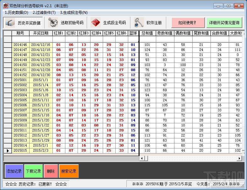 5.69 MB/2020-08-17《晴天双色球分析软件》是一款开放式的过滤条件设置及管理的彩票软件,在软件里用户可以任意的添加、修改、删除各种过滤条件!【晴天双色球分析软件主要功能介绍】1.历史开奖数据a.数据表模式在数据表模式里可以查看到往期开奖的号码及对应的各条件值,比如和值、AC值、重开号码个数等等;b.号码分布图模式分布图模式提供了直观的历史开奖号码分布情况,并且可以在分布图里直接选取号码;c.分析表模式通过分析表可以直观
