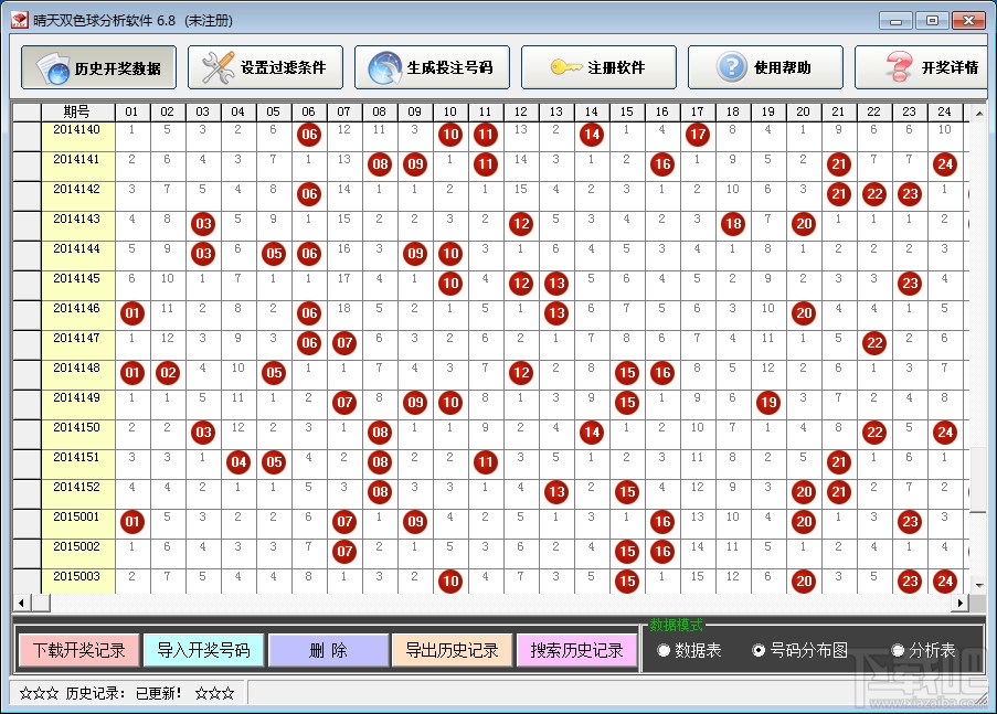 5.69 MB/2020-08-17《晴天双色球分析软件》是一款开放式的过滤条件设置及管理的彩票软件,在软件里用户可以任意的添加、修改、删除各种过滤条件!【晴天双色球分析软件主要功能介绍】1.历史开奖数据a.数据表模式在数据表模式里可以查看到往期开奖的号码及对应的各条件值,比如和值、AC值、重开号码个数等等;b.号码分布图模式分布图模式提供了直观的历史开奖号码分布情况,并且可以在分布图里直接选取号码;c.分析表模式通过分析表可以直观