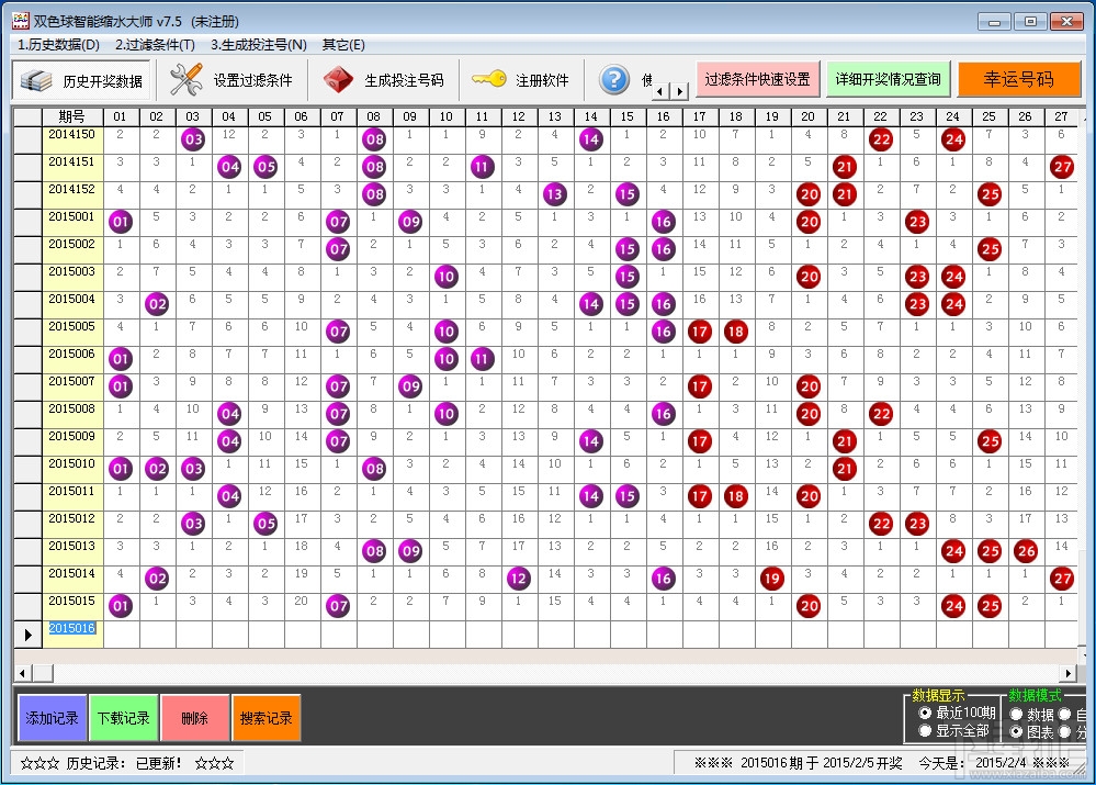 5.69 MB/2020-08-17《晴天双色球分析软件》是一款开放式的过滤条件设置及管理的彩票软件,在软件里用户可以任意的添加、修改、删除各种过滤条件!【晴天双色球分析软件主要功能介绍】1.历史开奖数据a.数据表模式在数据表模式里可以查看到往期开奖的号码及对应的各条件值,比如和值、AC值、重开号码个数等等;b.号码分布图模式分布图模式提供了直观的历史开奖号码分布情况,并且可以在分布图里直接选取号码;c.分析表模式通过分析表可以直观