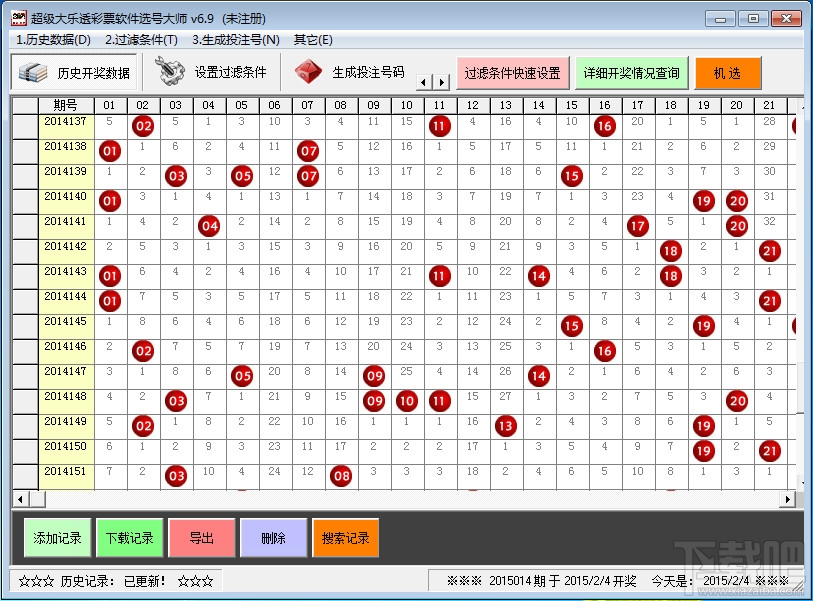 超级大乐透软件选号大师巧妙地利用了彩票开奖号码短期内的规律性,特别加入了与历史数据进行各种比较后再过滤的方法!其成功率非常之高!软件功能丰富,很适合各种技术层次的彩民使用;软件内的"自定义组"过滤方法更能使"技术型"彩民的优势能够得到比较大限度的发挥!(软件内包含了各期开奖数据的详细资料,开奖号可自动核对、自动更新无需手工输入,选号可以导出保存到文本文件,也可以从文本文件中导入,是一款图形化的彩票分析工具,内置了各种最有效的彩票过滤方法!其独特的智能化过滤缩水功能,可过滤掉众多的垃圾组合,除了常用的过滤方法,"自定义过滤"功能更可以为用户灵活的设置各种过滤条件! "超级大乐透彩票软件选号大师"将为您节省大把的买彩资金,使彩票投资的效益比较大化!)