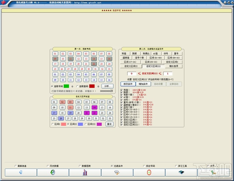 7.41 MB/2020-08-17双色球选号大师是一款集号码走势分析、号码选取、号码过滤(缩水)、开奖核对,历史数据自动网上更新为一体的界面美观、操作简单的专用于福彩双色球的彩票软件!其内置了各种最有效的彩票过滤方法!其独特的智能化过滤缩水功能,可过滤掉众多的垃圾组合,