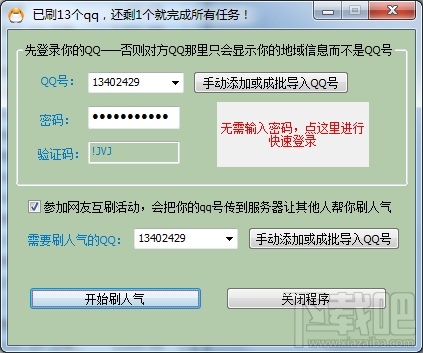 在下面“需要刷人气的QQ”那里填上你想刷人气的qq号,然后点“开始刷人气”按钮就可以了。