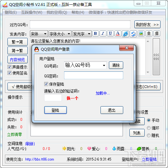 QQ空间小秘书是QQ空间辅助软件,无需进入对方的QQ空间,就可以快速的给对方留言和日志评论,再也不用忍受访问慢的烦恼,而且还可以快速给您自己写日志、写心情、以及转载别人的日志。