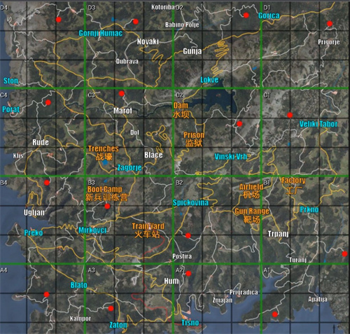 红色地点为军事基地,蓝色是设计有警察局的城镇,黄色区域为重要建筑群,白色则代表普通小镇。