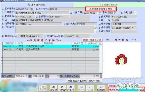 快速查询功能:对于系统中已录入的客户数据,依客户编号、客户名称、服务单位、联络电话、手机号码、住址等条件,系统将自动显示起先搜索到的客户的详细记录。
