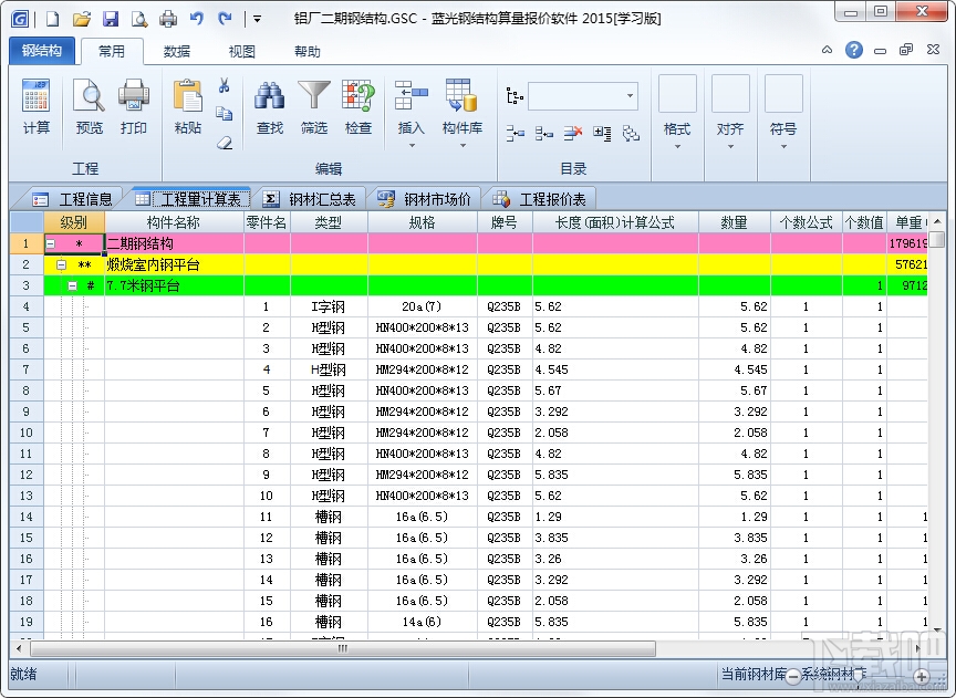 蓝光钢结构算量报价软件用于钢结构工程量快速计算、汇总、工程报价。软件内置50多种型钢国标规格、型号,针对非国标钢材规格,我们内置型几十种型钢单重计算、表面积计算。软件采用树状表格录入,自动进行分级统计,支持自定义单元格公式计算汇总,软件自动根据型号、牌号对钢材总重量、总面积进行汇总,并支持钢材汇总反查工程明细。系统钢材库支持编辑、补充功能。钢材选择时支持编码、拼音首字母快捷录入方式,极大提高了录入效率。软件避免了手工计算容易漏算的弊端,打印的底稿非常清晰,易于核对和找出差错。