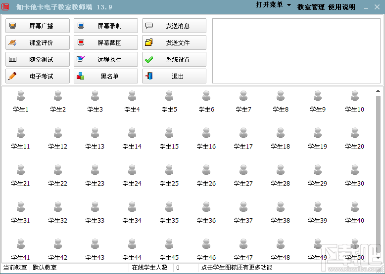 7.58 MB/2020-08-17伽卡他卡电子教室软件由伽卡他卡公司推出的一款免费无限制的多媒体教学软件,能够完美支持Win7/Win832位和64位操作系统。主要功能:考试系统(支持WORD试题、操作题),P2P聊天、文件收发,日志考勤、屏幕广播、屏幕录相、学生演示、查看屏幕、远程控制警告、远程关机重启、远程开机、远程执行、黑名单(限制上网功能)、课堂评价、随堂测试、教室分隔主要特色:屏幕广播流畅不卡、登录双选择、退出保护机制