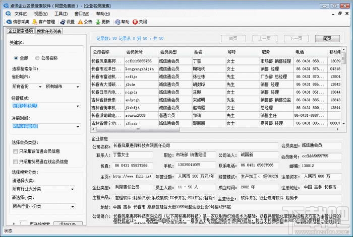 卓讯企业名录搜索软件(阿里免费版)【阿里巴巴企业名录采集软件】是一款专业针对营销计划的辅助型软件,卓讯企业名录搜索软件可以采集到阿里巴巴企业名录所有会员的信息包括:公司名称, 会员帐号,会员类型,姓名,称呼,职务,电话,移动电话,传真,地址,邮编,公司主页,公司介绍,主营产品或服务,主营行业,企业类型,经营模式,注册资本,公司注册地,员工人数,公司成立时间,法定代表人或负责人,主要客户,年营业额,主要经营地点,经营品牌,管理体系认证,开户银行,银行帐号,质量控制,年进口额,年出口额,研发部门人数,厂房面积,月产量,工商注册信息。