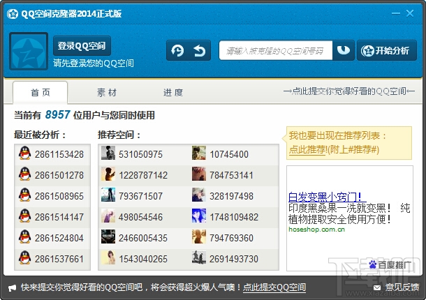 QQ空间克隆器是一款免费的QQ空间克隆工具,即使您不会做QQ空间的模块皮肤,也可以用QQ空间克隆器一键将别人的漂亮空间装扮克隆给自己,大大节省了QQ空间装扮的制作时间,也为那些不会制作模块、皮肤的网友提供了方便。