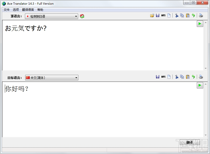 Ace Translator(王牌翻译)中文绿色版是一款功能非常强大的国外在线翻译软件。Ace Translator采用了强大的Altavista BabelFish在线翻译引擎,支持中文、英语、日语、韩语、俄语等81个不同国家语言之间的互译,支持文本 – 语音(TTS)转换,您还可以通过该翻译器即时翻译外文网站、电子邮件、聊天信息等,充分满足了你的日常工作和学习要求。另外还支持语音朗读、输入和翻译的语言读音保存为MP3文件等功能。