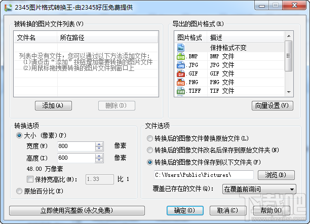 2345图片格式转换器支持多种格式图片的压缩裁剪转换功能。图片格式转换器目前支持图片转换的格式有:BMP JPG GIF PNG CUR TIF TGA PCX WBMP WMF JP2 JPC PGX RAW SKA。照片格式转换器支持导出的图片格式有:BMP JPG GIF PNG TIFF TGA PCX PNM 。