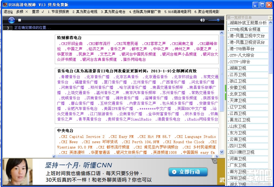 USB电视棒软件包括有高清直播、标准指标、国际电视、高清电影、高清MTV、在线游戏、及Radio电台等多个栏目。国内的电视台绝大部分能正常播放。少数地方台不能播放或者不稳定这也属正常。使用本软件,不需要插入电视棒软件,更不需要付费!!