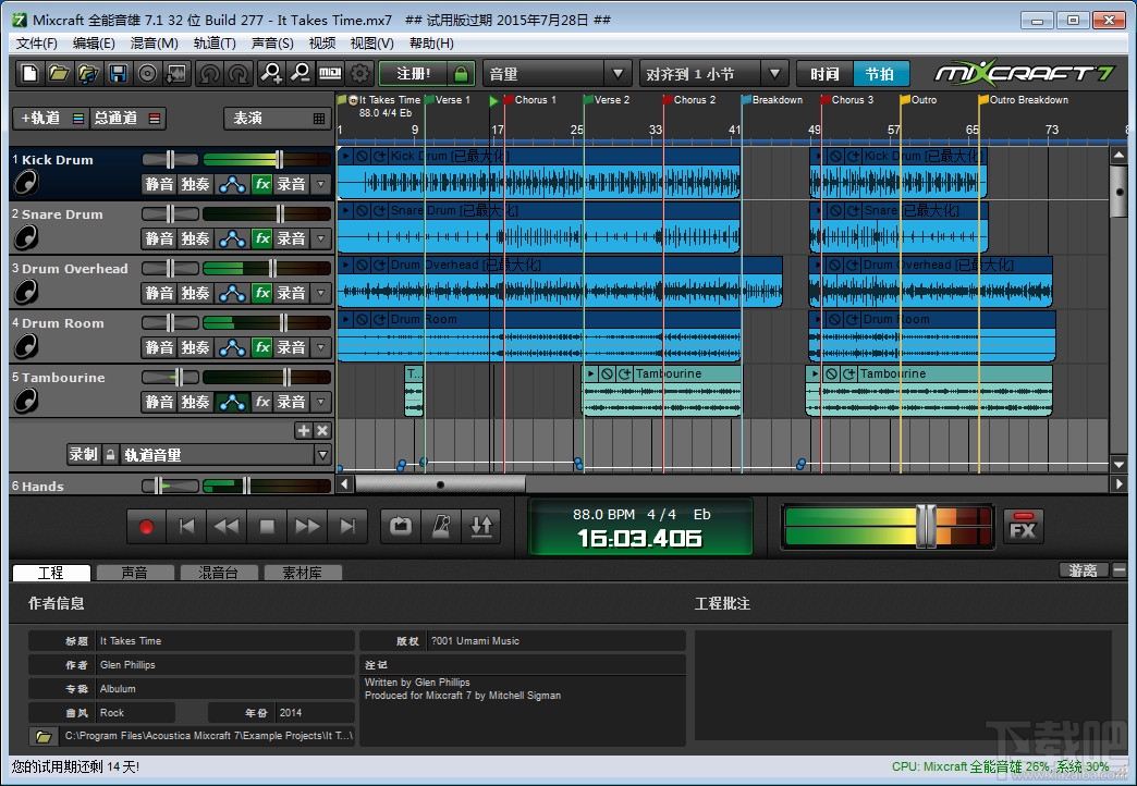 Mixcraft 多音轨音效混合器软件可以录制音频,安排循环,混音曲目,缀以MIDI和虚拟乐器,添加效果,比分和编辑视频,混合和掌握你的轨道创造抛光,专业组成。 Mixcraft是你的音乐制作梦想成真,瞬间将你的电脑变成一个储备齐全的专业音乐录音棚。
