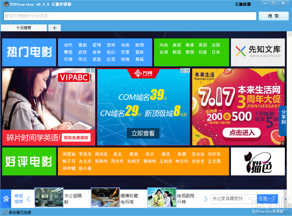 搜种神器是一款绿色免费的互联网无限制搜索器BT种子资源搜索神器,基于先进的P2P搜索技术,可快速搜索全球ED2K网络资源。P2P种子搜索器简单便捷的搜索到电驴ED2K网络上共享的海量音影娱乐、学习资料等资源。搜种神器p2p无限制搜索器搜索出来的资源不仅可以用迅雷、电驴下载,还可以使用百度云盘、360云盘等网盘的离线下载功能下载,从而实现不下载在线播放电影。