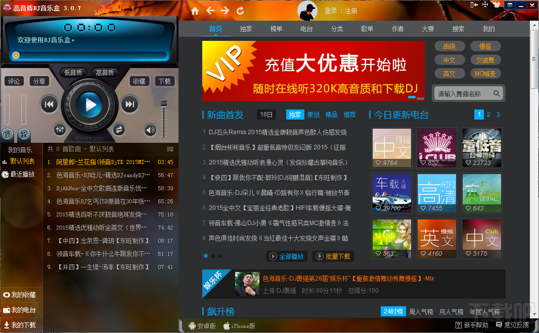 高品质DJ音乐盒是一款高品质的DJ音乐盒,新2014版是国内第一款320kbps高音质mp3格式DJ舞曲在线播放的音乐盒,具有“DJ超多”“音质超高”“完全免费”三大特点,0万多首DJ舞曲无需下载,一点即播。