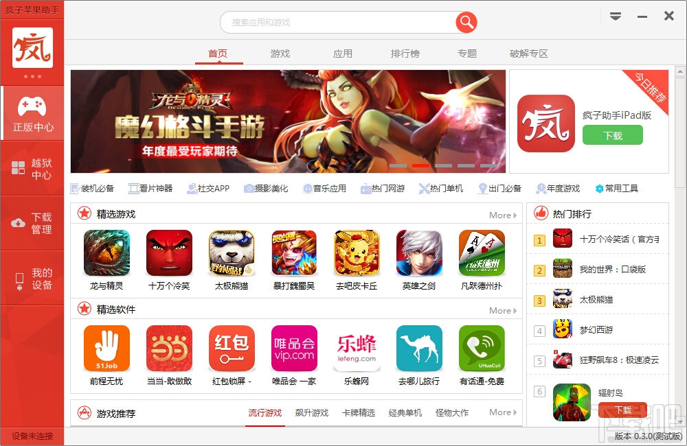 疯子苹果助手是首款无需闪退修复的苹果助手。同时支持iPhone、iPad、iTouch等iOS设备的软件、游戏资源的下载安装。疯子苹果助手是苹果手机用户比较受欢迎的应用下载平台,不越狱装软件的唯一选择,海量正版软件游戏,每日都有新增,全部免费安装,不需理会手机是否越狱。