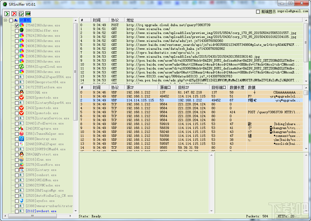 SRSniffer是一款可以查看指定进程、软件的网络嗅探器,避免了手动筛选某个软件通讯数据的麻烦,支持多网卡切换。SRSniffer基于被动侦听原理的网络分析方式,可以监视网络的状态、数据流动情况以及网络上传输的信息。SRSniffer可以监听网卡数据包,分析出HTTP数据,可以根据选择监听指定进程。特殊标注出程序、影音、文档等特殊文件,视频、音乐类的网站资源都可以轻松下载了。数据包列表使用两种颜色区分发送和接收,更直观。