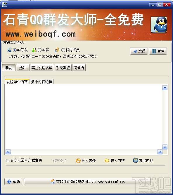 石青QQ群发大师一款够效率的QQ群发软件,石青QQ群发大师完全免费,下载可以直接使用,没有任何使用限制,独创的所见所得的发送模式,快速发布信息,高效稳定,支持QQ和QQ群,群成员。