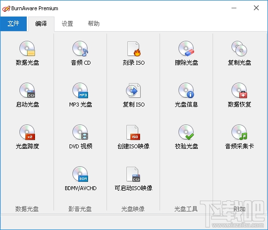 BurnAware的界面清晰简单,功能分类一目了然。它支持我们最常用的CD光盘、DVD光盘的刻录以及新的蓝光光盘(Blu-ray Disc)的刻录,实在是相当实用。