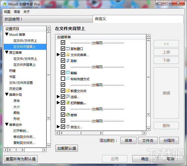 Moo0右键专家是增强右键菜单(Windows资源管理器中的右键菜单)的设置。 它增加了很多有用的功能例如复制当前浏览器窗口,打开/移动到/复制到书签文件夹,隐藏默认情况下的菜单,等等。