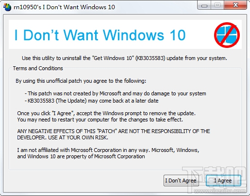 现在很多在使用Win7/Win8的朋友都会在桌面的右下角看到一个“获取Windows10”图标,这是微软的Win10推送通知。这个图标其实就是安装KB3035583这个补丁造成的。I Don't Want Windows 10是一款能够一键关闭win10升级通知的工具。I Don't Want Windows 10将删除补丁KB3035583,然后用户重新启动电脑,从而能够彻底关闭桌面右下角的Windows 10升级通知图标。