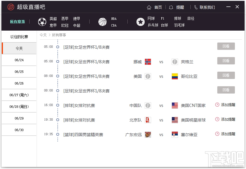 直播赛事囊括欧洲五大联赛、NBA、中超、网球、台球、F1、拳击等。用户可查看当天及后1~2周的赛事直播列表,选择自己喜欢的赛事通过视频直播源在第一时间观看精彩比赛。超级直播吧另一重要功能是用户可自定义设置赛事提醒。用户可根据自己的喜好设置某一场或多场赛事的提醒功能,到比赛开始前在电脑桌面自动提醒,不会错过任何一场比赛。