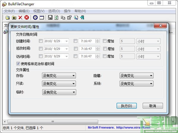 BulkFileChanger是个批量修改文件属性的小工具,它允许你创建一个指定的文件列表,可以包括多个文件夹,然后修改其中文件的创建/修改/访问时间,变更文件属性,以及添加运行参数等,还可以将列表中的文件拷贝/粘贴到Windows资源管理器。