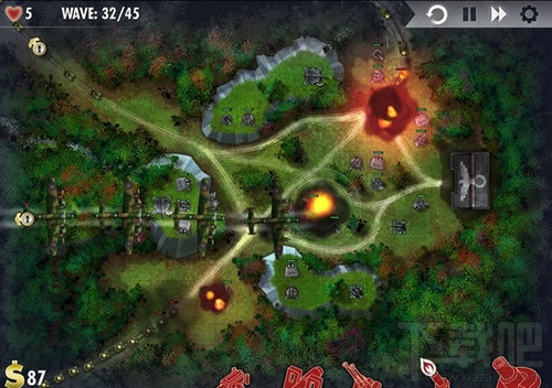 在《轰炸机防御战》中并非靠以数量取胜,将防御工事进行合理配置与升级也非常重要。后期基本上都是重装甲单位,前期的武器效果就很低了,你可以完全拆除它们而改用炮台。减速也很重要,较好在每个路口都放置。游戏的玩法十分灵活,喜欢塔防的玩家值得一试。