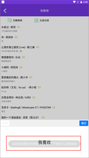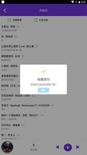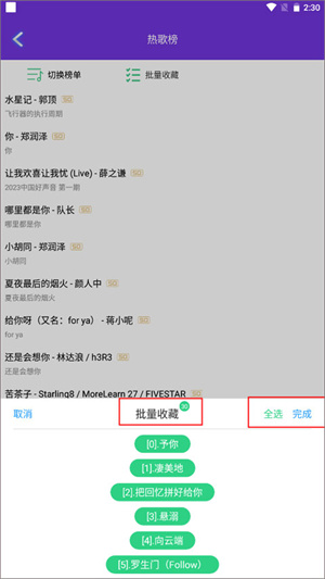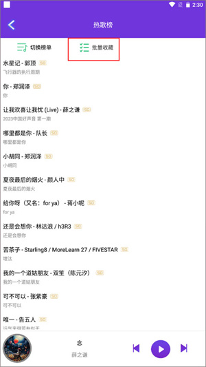 2、歌曲列表中就会有很多的音频等你收藏,点击右上角的“批量收藏”功能。