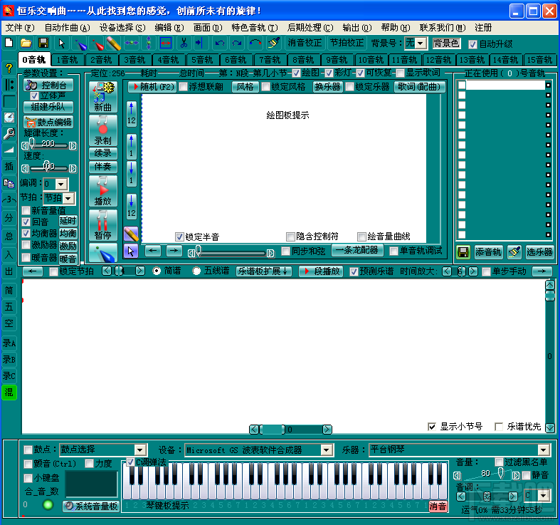 恒乐交响曲是目前最快速的作曲软件!会源源不断自动作曲并演奏、为用户提供了快捷的自动或手动的音乐创作空间。可在鼠标点击的瞬间生成一首大师级的乐曲的主旋律、可为现成的歌词配曲、有多种现成的作曲风格可选择或根据需要创建新的作曲风格;可将现场弹奏变为乐谱;一条龙配器功能,可在几秒钟内由一个主旋律音轨衍生出多恒乐交响曲首创自动生成各种风格的乐曲、首创单键控制乐队发音、首创用曲线来描述音乐的旋律、首创多音轨发音的同时插入伴奏的新音轨、首创将不同的音轨重叠在一起编辑或打印、首创将电子琴、电脑鼓机、作曲软件融合在一体、首创为中文自动配曲等等。是您开创新乐章的首选。