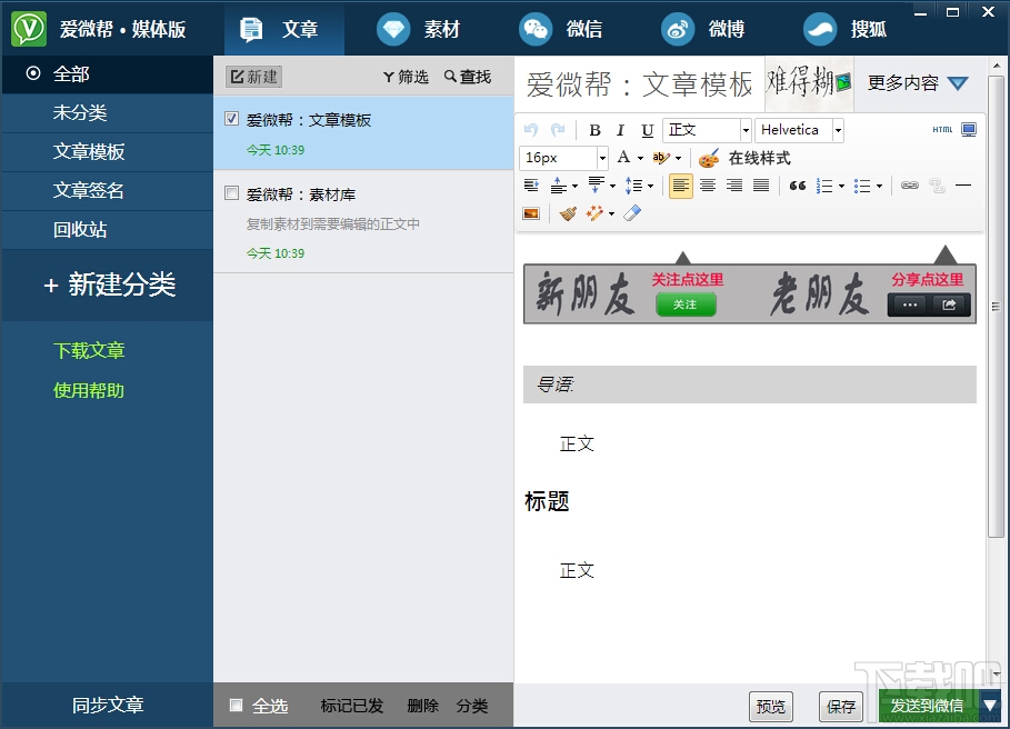 1、文章管理;支持文章本地编辑,文章可直接发送到微信或微博文章中可选择签名。