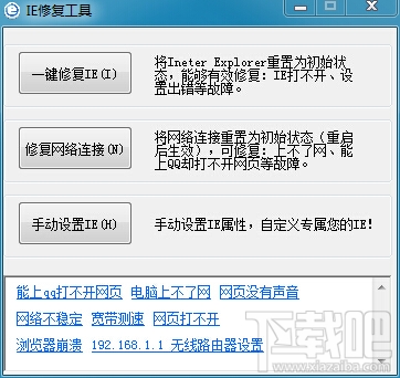 IE修复工具是一款针对IE浏览器无法打开、IE浏览器崩溃、IE首页被篡改及用户无法上网所专门研发的一款浏览器修复工具,使用本工具能够一键重置您的IE浏览器为初始状态,有效的解决了电脑无法连网,浏览器设置有误等问题,同时软件还可以将网络设置初始化,彻底解决了上不了网、打不开网页的问题。