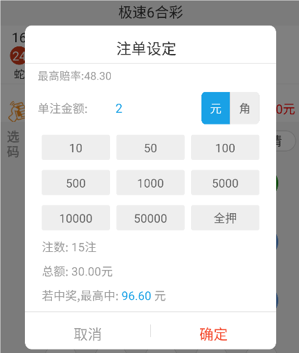 4、选好号码以后,选择单注的金额,根据赔率可以调整不同数字的下注额度。