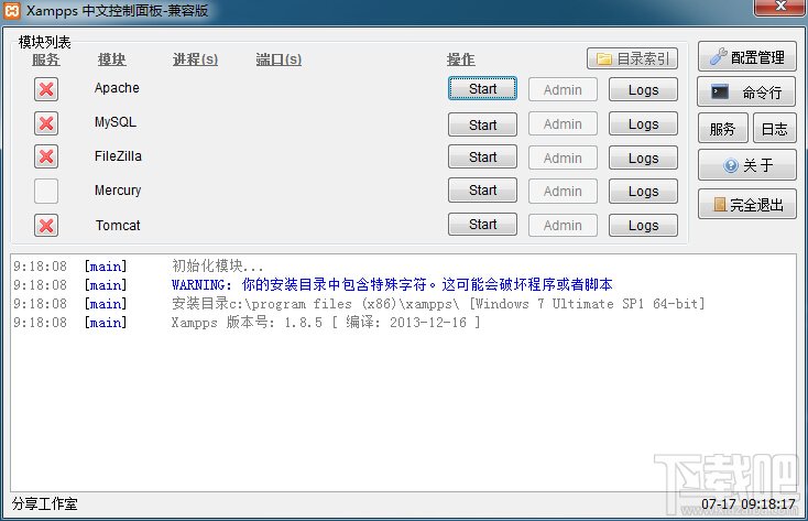 Xampps是整合型的Apache套件,是Windows平台下Apache + PHP + MySQL + PHPmyadmin的一键集成工具。Xampps 1.8.5包含Apache 2.2.25、MySQL 5.1.7、PHP 5.2.9、phpMyAdmin 4.0.5、OpenSSL 0.9.8y、Zend Optimizer v3.3.3、FileZilla FTP Server 0.9.41、tomcat 7.0.42和Mercury Mail 4.74。现在Xampps32位与64位全部集成一致,完美兼容各系统。