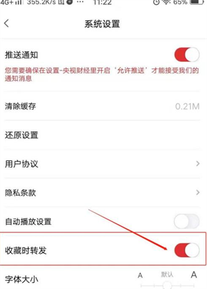 2、进入系统设置页面,然后点开收藏时转发按钮就可以。