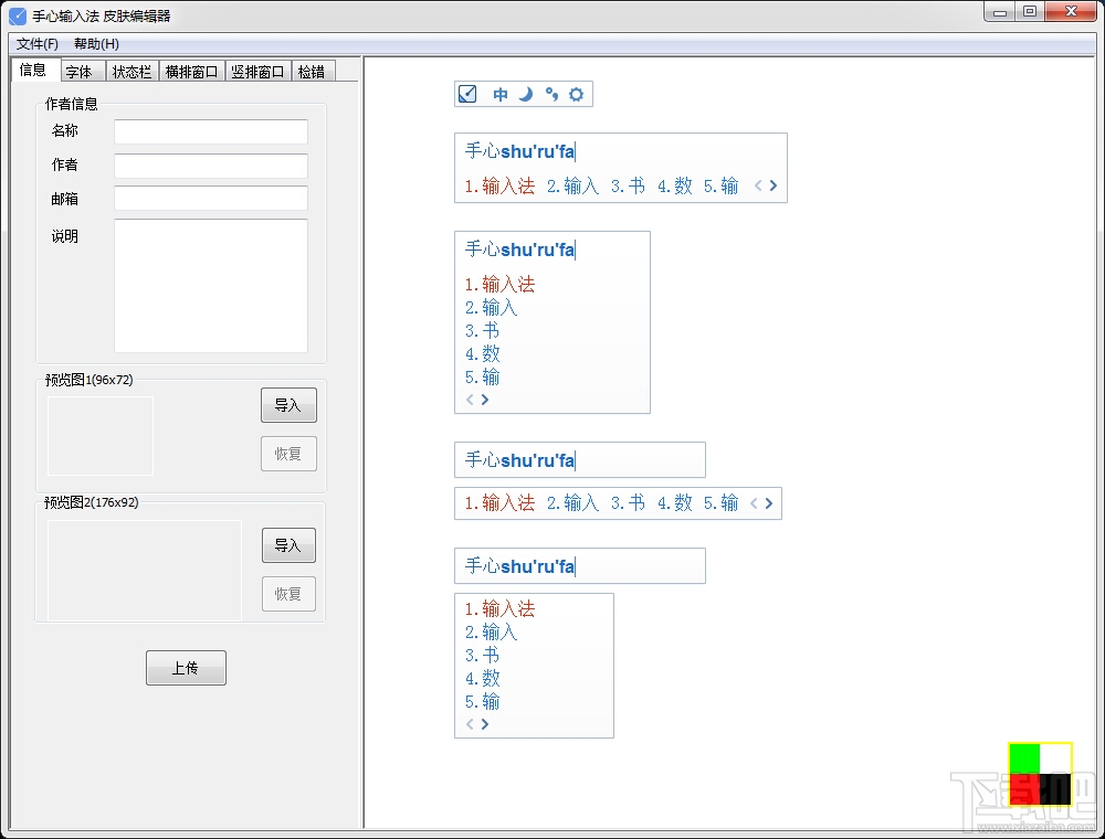 手心输入法皮肤编辑器是一款绿色的由手心输入法官方推出的手心输入法皮肤制作软件。软件功能强大,操作简单,可以设置输入法字体大小、字型、拼音串颜色、焦点候选词颜色、光标颜色以及状态栏、横排窗口、竖排窗口等元素。手心输入法皮肤主要分为三大部分:状态栏、输入栏、候选栏。其中状态栏上显示各功能按钮,每一个按钮可以有三种状态(标准状态、鼠标悬停、鼠标按下),输入栏上显示输入的拼音串和部分选中时的候选内容,候选栏上显示要输出的内容。