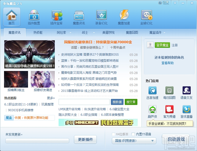 下载完多玩魔盒后,直接点击运行,再点击上方图标按钮中的“更新设置”,确认你的游戏客户端位置(特别是安装有国服和台服两个版本的玩家,一定要注意,较好手动指定各自客户端的位置),确定后点击下方中间的“插件更新”按钮。