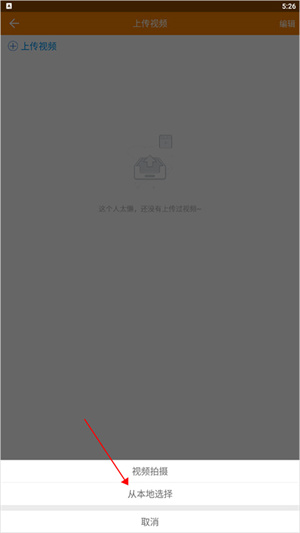 3、在底部弹出的下拉选项中选择一种视频上传方式,此处以点击【从本地选择】为例子。