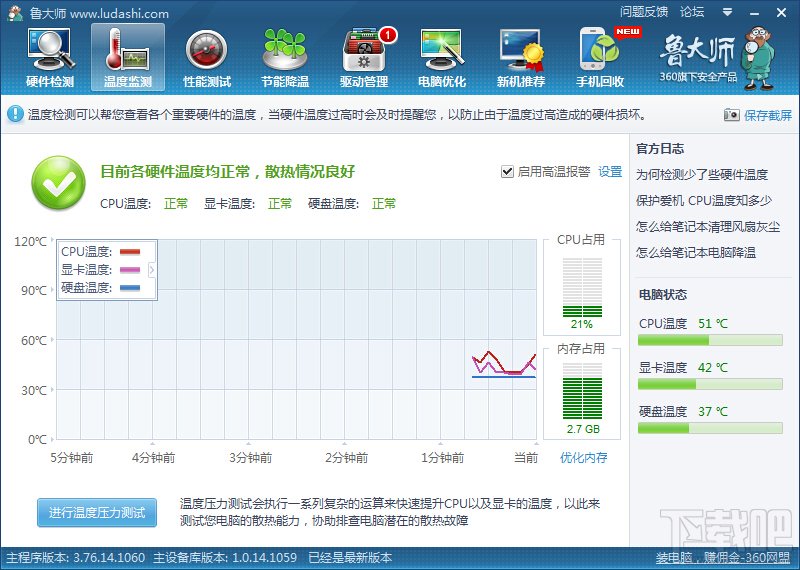 6.25/2020-08-17鲁大师(原:Z武器),不是鲁大妈也不是鲁大叔,鲁大师电脑版是一款专业而易用的硬件检测工具,不仅超级准确,而且向你提供中文厂商信息,让你的电脑配置一目了然,拒绝奸商蒙蔽。鲁大师2017官方下载适合于各种品牌台式机、笔记本电脑、DIY兼容机,实时的关键性部件的监控预警,全面的电脑硬件信息,有效预防硬件故障,让您的电脑免受困扰。鲁大师电脑版帮你快速升级补丁,安全修复漏洞,系统一键优化、一键清理、驱动更新。更有硬件温度监测等带给你更稳定的电脑应用体验。