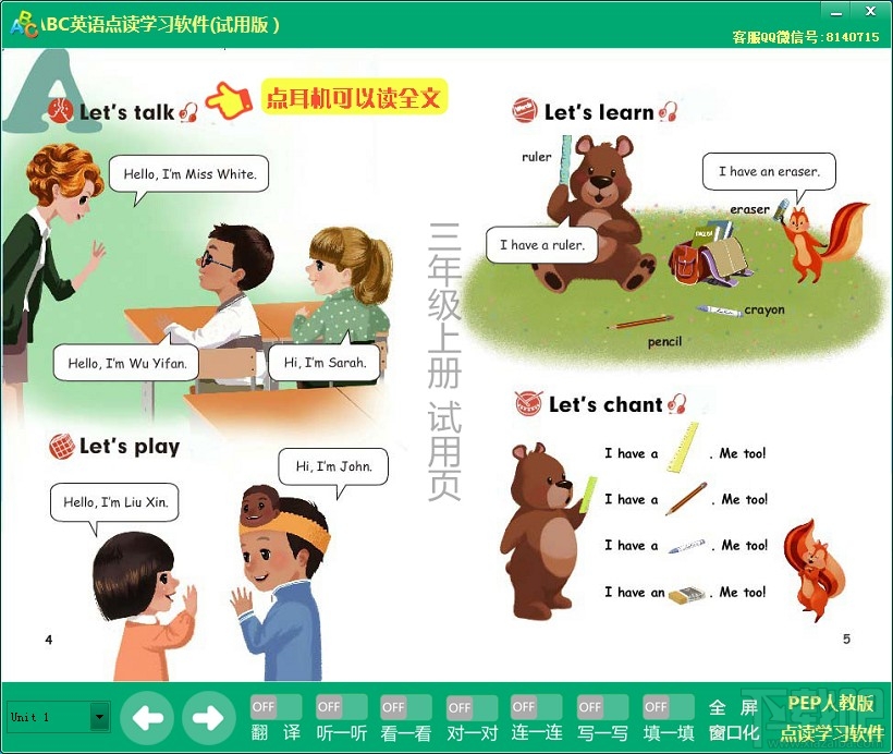ABC英语点读学习软件新PEP人教版小学英语点读学习软件根据人教版教材编写,发音标准。使用时不仅能看到课本图画,而且能听到读音。功能非常强大,哪里不会点哪里,中文提示,强大的题目训练功能。