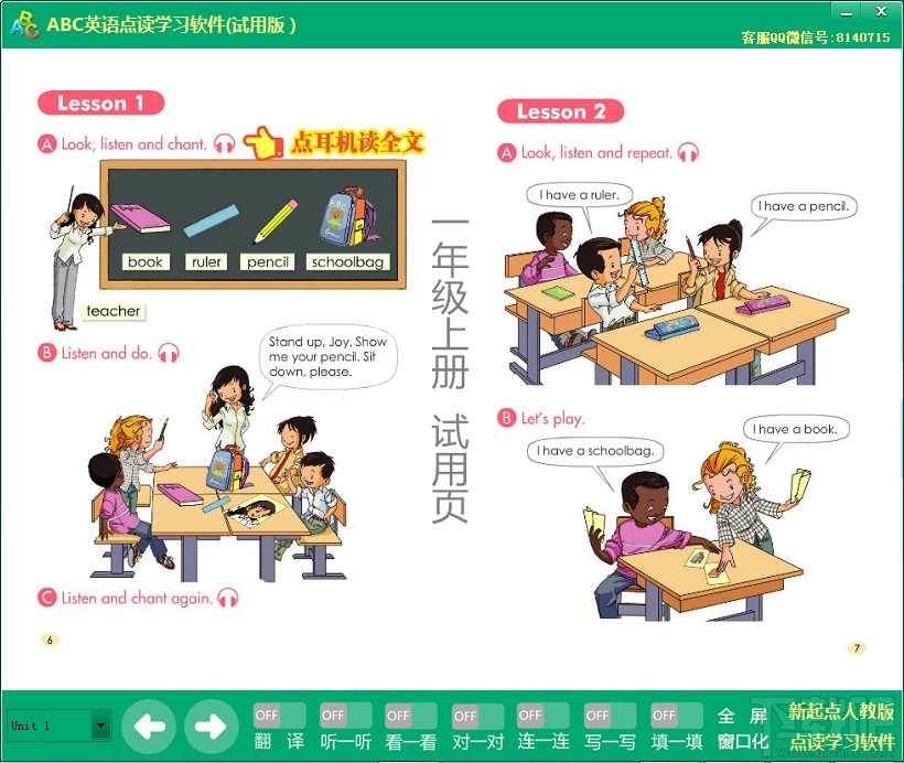 ABC英语点读学习软件新人教版新起点小学英语点读学习软件学习机 电子课本根据人教版教材编写,发音标准。使用时不仅能看到课本图画,而且能听到读音。功能非常强大,哪里不会点哪里,中文提示,强大的题目训练功能。
