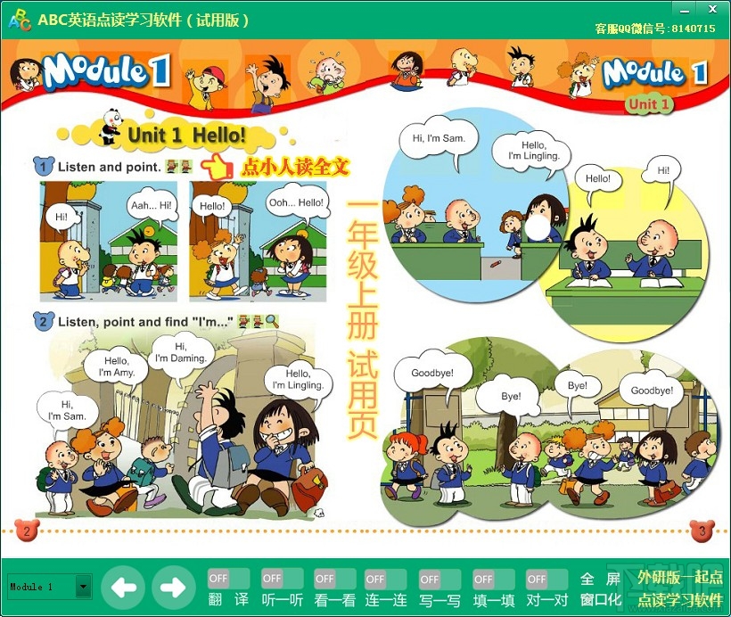 ABC英语点读学习软件外研社一起点小学英语点读软件根据外研社教材编写,发音标准。使用时不仅能看到课本图画,而且能听到读音。功能非常强大,哪里不会点哪里,中文提示,强大的题目训练功能。