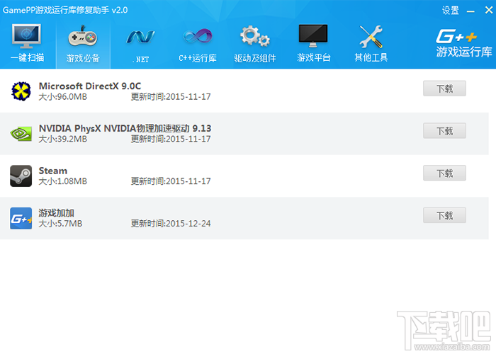 GamePP游戏运行库修复助手是游戏加加专为游戏用户打造的最简单、好用、贴心的游戏环境修复工具,主要用于修复因为电脑上缺少文件、没有安装游戏必须环境或版本不正确造成的提示错误、缺少文件等报错问题。GamePP游戏运行库修复助手集成32位和64位运行库,是目前新最全的常用运行库合集,能自动扫描系统版本以提供适合您的组件,让您组件缺失不愁,游戏运行无忧。