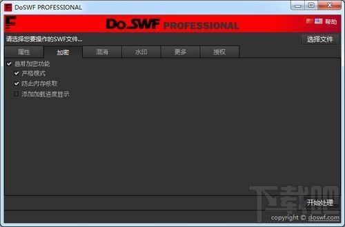 DoSWF是一款flash/swf加密绿色软件。1.支持as2及as3的加密。目前反编译器完全看不到代码。2.支持对as3的混淆,让反编译器看到的是一堆乱码。3.支持对as3注入随机代码,让反编译软件直接崩溃退出。4.支持一个项目多个swf同时处理(doproject特性)。5.支持对swc文件的加密。6.方便对as3的swf添加文字、图片水印。7.支持对as3的swf进行剔除重组,方便模块开发。