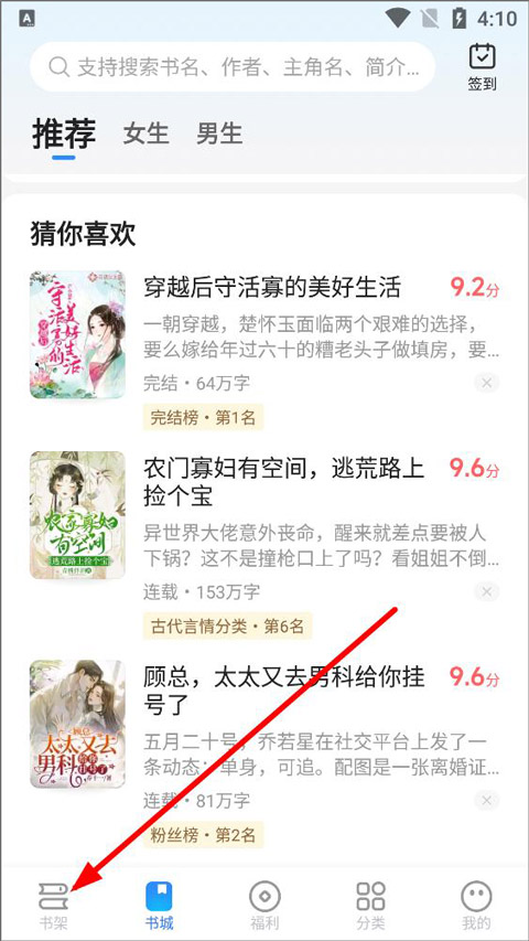 1、打开星空免费小说app,登录进入书城页面,用户可在书城查看推荐、男生、女生以及搜索想看的书籍,点击书架;